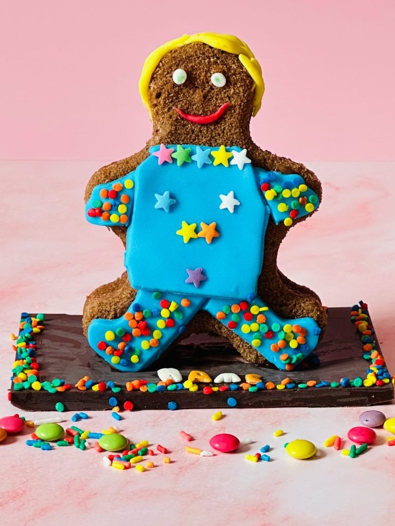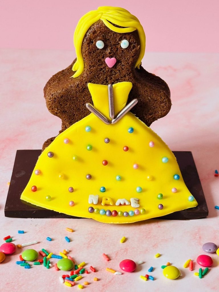 First, make an easy soft chocolate cake. Second, prepare a lovely dress to cover it. It's not finished yet, add your name on it!
